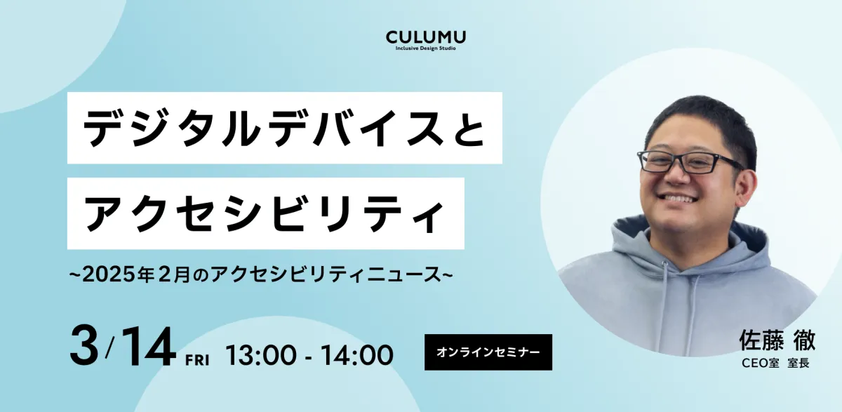 2025年2月を見据え、デジタルデバイスとアクセシビリティをテーマとしたセミナーが3月14日(金)に開催されます。このセミナーは、株式会社STYZが運営するインクルーシブデザインスタジオCULUMUが主催し、オンラインで行われるため、どこからでも参加可能です。