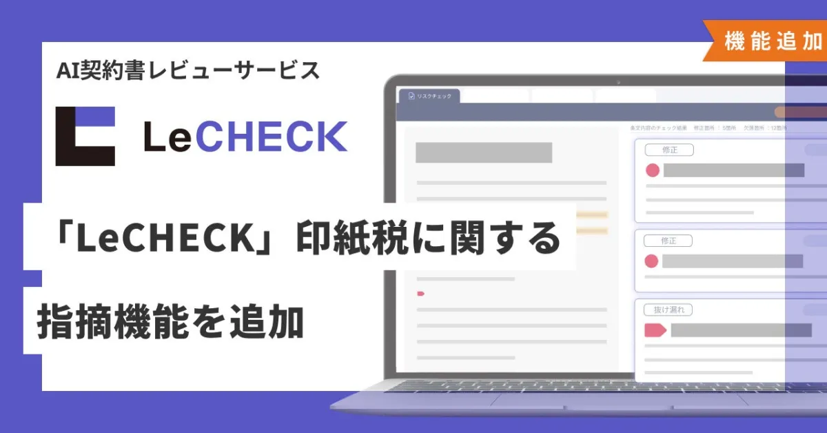 株式会社リセが提供するAI契約書レビューサービス「LeCHECK」は、契約書の精査を行う高精度なAIを搭載しています。昨今のビジネスにおいて契約書の締結は避けて通れないものですが、その過程で発生する印紙税に関する判断は多くの企業にとって大きな負担になっています。そこで、リセは印紙税に関する判断機能を新たに追加し、ユーザーが契約書が課税対象かどうかを簡単にチェックできる空間を提供します。