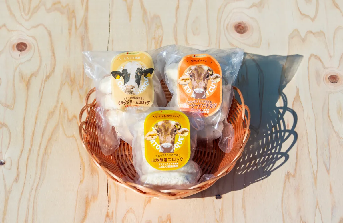 このコロッケシリーズは、島根県の魅力的な里山で育ったブラウンスイス牛から取れる牛乳と肉を基にした3種のバリエーションから成ります。特に、この牛は自然豊かな環境の中でのびのびと育てられるため、肉質や風味が優れているのが特徴です。