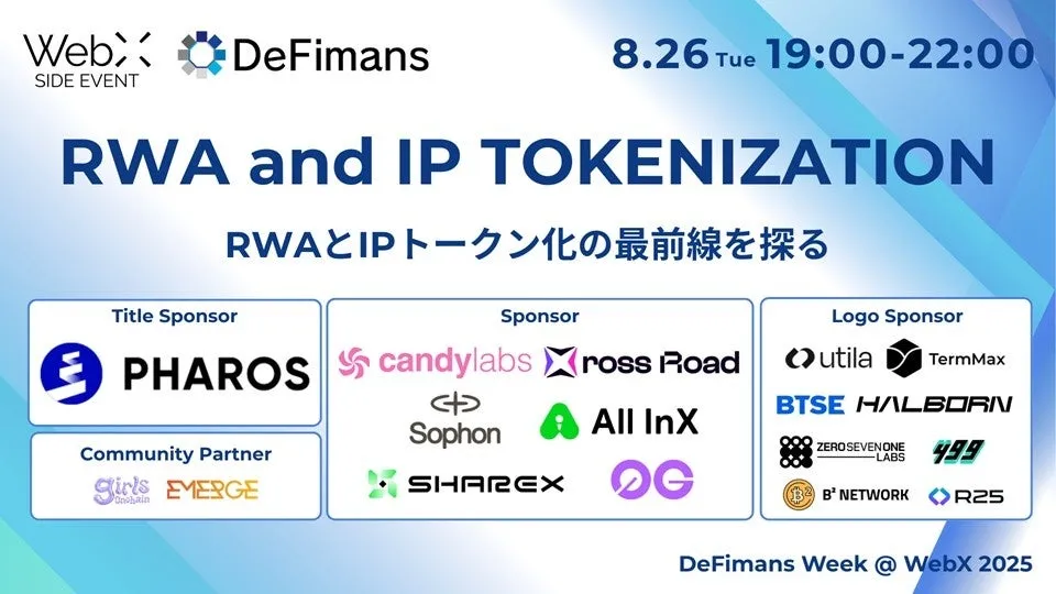 2025年8月26日(火)、東京都港区にて株式会社DeFimansによる「RWA and IP TOKENIZATION」イベントが開催されました。このイベントは、現実の資産(RWA)と知的財産(IP)領域におけるトークン化に焦点を当て、多様な業界関係者約150名が集まりました。出席者にはエンタープライズ企業、金融機関、クリエイター業界の人々が含まれ、ネットワーキングの場としても機能しました。特に、アニメプロデューサーの木村誠氏とサンリオの濵﨑皓介氏を迎えたパネルディスカッションが印象的でした。