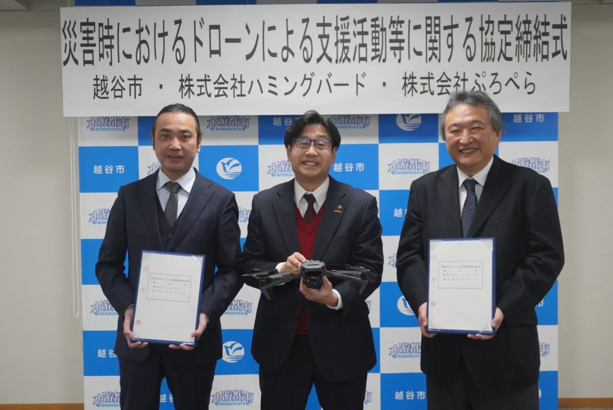 埼玉県越谷市と株式会社ぷろぺらが運営する「ドローンスクール埼玉レイクタウン」が、災害時におけるドローンを用いた支援活動に関する協定を締結しました。この協定は、日本最大級のドローンスクールを展開する株式会社ハミングバードと共同で取り組まれています。
