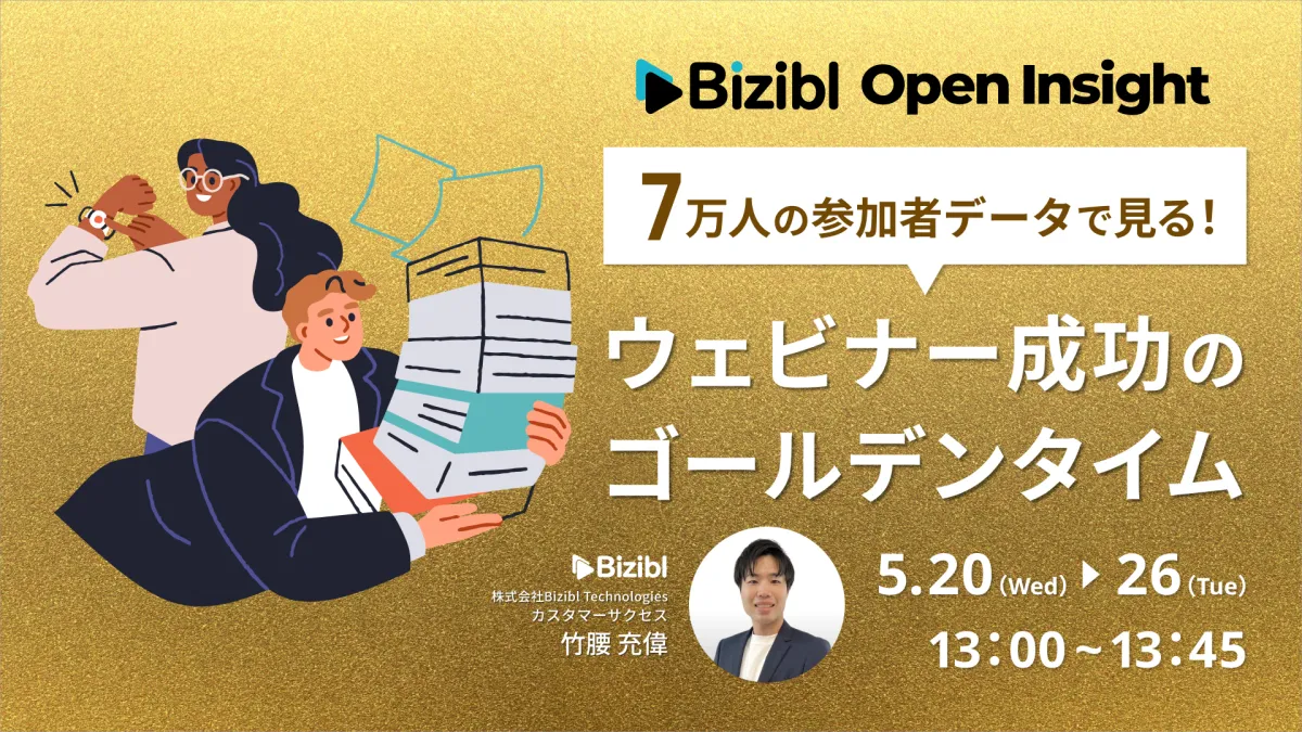 2026年5月20日から5月26日まで、Biziblは「7万人の参加者データで見る!ウェビナー成功のゴールデンタイム」というタイトルのウェビナーを開催します。このイベントでは、2025年度に収集した7万人の参加者データを用いて、業界や職種ごとに効果的な開催曜日や時間帯を明らかにします。