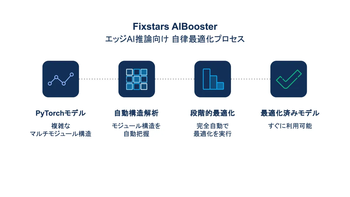 フィックスターズは、自社の「AIBooster」をエッジAI推論向けに最適化した新機能を実装しました。エッジAIとは、ローカルデバイス上でAIが推論を行うため、限られた計算リソースの中で最大の性能を引き出すことが求められます。新たに搭載された自律最適化機能では、PyTorchで構築されたAIモデルを対象に、各デバイスが効率的に機能するよう自動変換を行います。