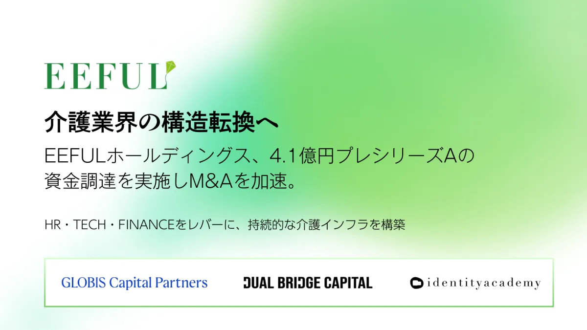 株式会社EEFULホールディングス(東京都港区、代表取締役:森山穂貴)が、総額4.1億円のプレシリーズA資金調達を実施しました。この資金は介護業界の変革を目指し、M&A(合併・買収)を加速させるためのものです。本ラウンドでは、グロービス・キャピタル・パートナーズをリード投資家として、Dual Bridge CapitalとIdentity Academy(Future Identity Capital)の3社が参加しました。