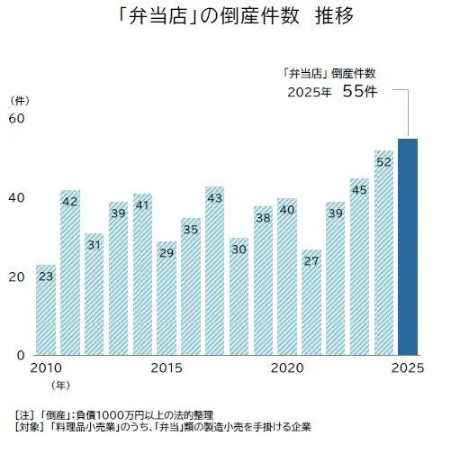 近年、弁当店の倒産件数が増加傾向にあり、その背景には様々な要因が絡んでいます。2025年には、仕出しやテイクアウトを主力とする弁当店の倒産数は55件に達し、前年を上回る結果となりました。特に、この傾向は中小企業にとって深刻な問題となっています。