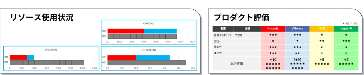 トラフィックやCPU、メモリー、ストレージ利用状況を徹底的に分析し、仮想マシンの構成を把握。その結果をリポートとして提供します。