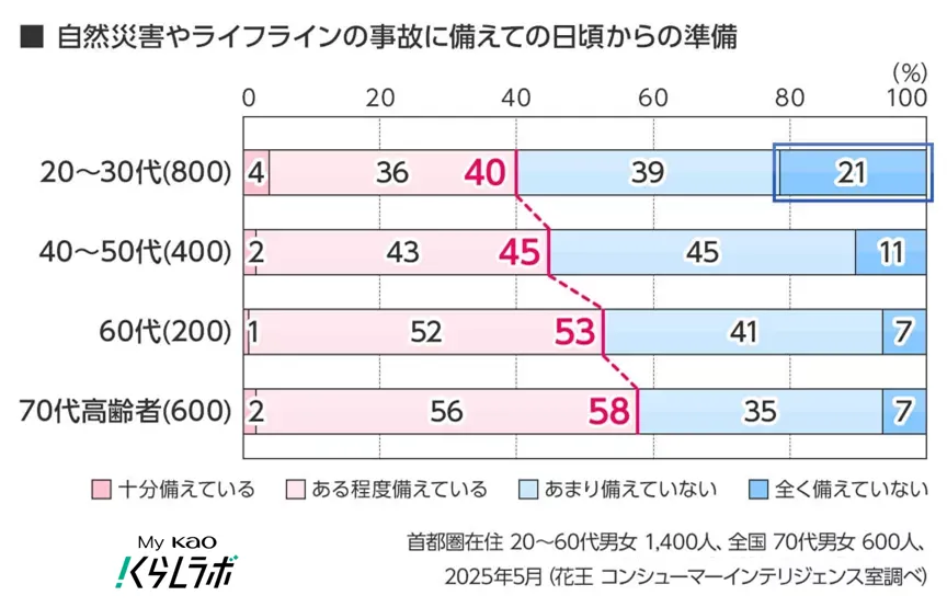 調査の結果、特に若年層の備え不足が目立つことが明らかになりました。具体的には、災害への備えが最も低いのは20~30代の若者たちであり、年代が上がるにつれて備えがしっかりしていく結果となりました。一方、障害を持つ方や高齢者は、一定の備えがあってもなお不安を抱えていることも分かりました。