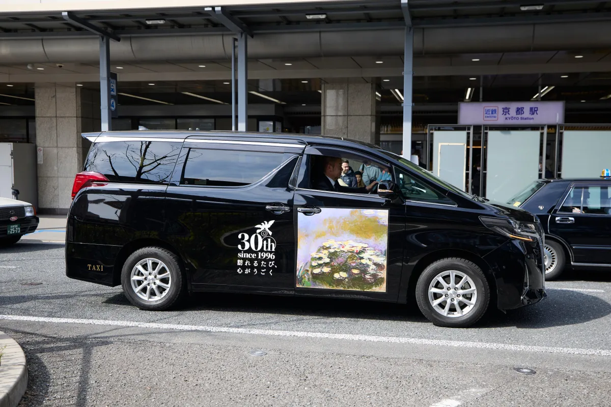 今回の企画では、当選した20名の参加者が、京都駅から美術館までを無料で移動する特別な体験を提供しました。オリジナルラッピングが施された広々としたハイヤーの中では、特別に制作された「アサヒグループ大山崎山荘美術館 開館30周年記念映像」を鑑賞し、さらにはアサヒグループ商品やサンプリングを楽しむことができました。