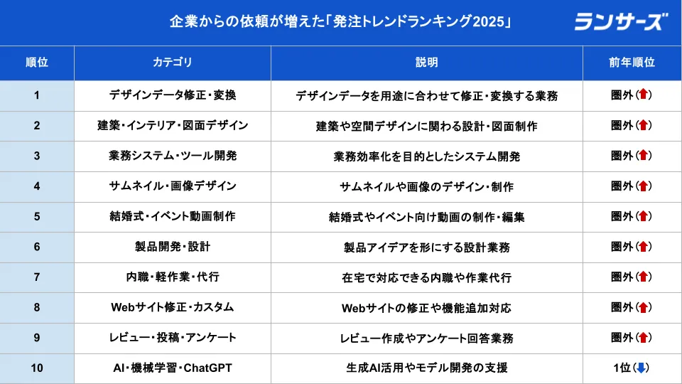ランサーズ株式会社が12月16日の「フリーランスの日」に公開した「発注トレンドランキング2025」では、ここ数年のビジネスマッチング業界の変化が如実に表れています。このランキングは、企業から発注された仕事をもとに、各カテゴリ別の発注数を集計した結果です。特に、2025年がもたらすAIの業務利用が本格的に進行していることが背景にあります。