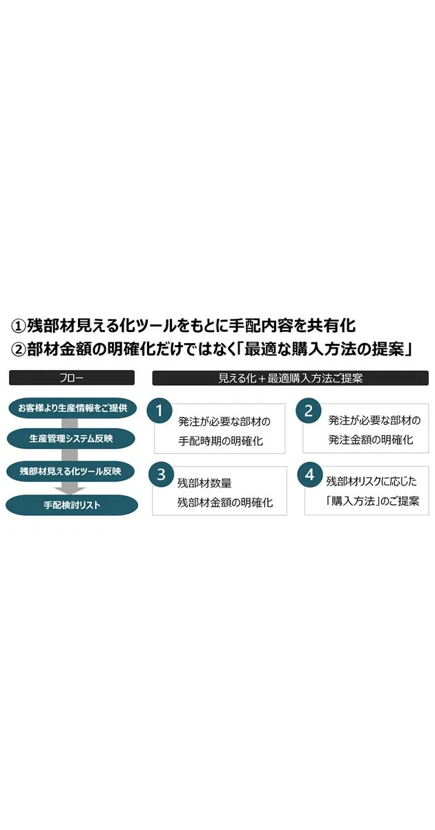 この問題意識のもと、OKIは顧客と共にリスクを理解し、最適な購入方法を提案することで、棚卸資産の最小化を目指します。たとえば、部材の購入方法として、小ロット購入やEOL(生産終了)部材の代替品の提案、場合によっては単価は高めでも最終的な残額を減らす購入方法など、多様な選択肢を提供します。