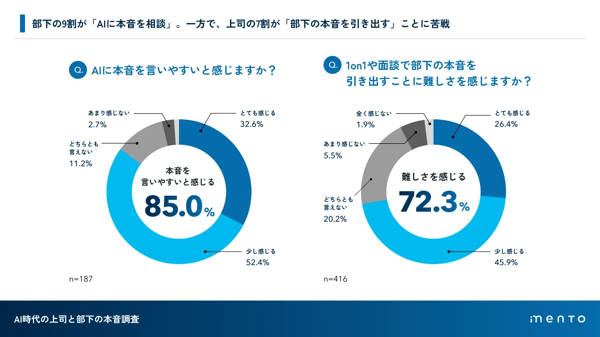 最近、AI技術の進化に伴い、職場内の人間関係やコミュニケーションが変わり始めています。株式会社mentoが実施した「AI時代の上司と部下の本音調査」によると、実に9割の部下がAIに本音を話しやすいと感じている一方で、上司の約7割は部下の本音を引き出すことに苦戦していることが分かりました。