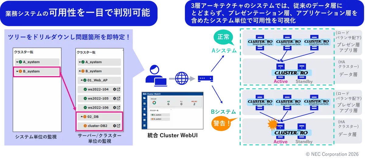 「CLUSTERPRO X 6.0」は、3層構造の業務システムに対応し、データ層に留まらずプレゼンテーション層やアプリケーション層を含めて、システム全体の可用性を一元的に把握できるようになります。これにより、システムの安定性が格段に向上し、顧客のビジネス継続性を強力にサポートします。