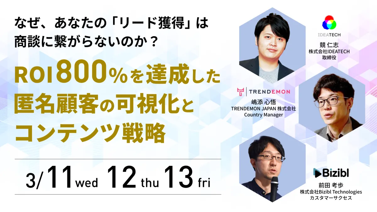 この文脈で注目されるのが、「匿名顧客の可視化」です。株式会社Bizibl Technologiesが主催するウェビナーでは、このテーマを通じて、どのように匿名ファネル段階のターゲットを可視化し、コンテンツ設計やウェビナーの活用を通じて継続的な接点を生み出せるのかを探求します。