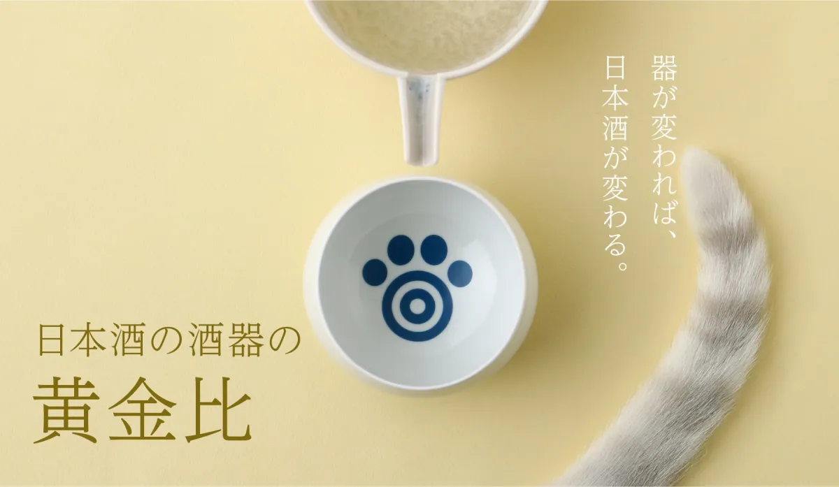 見込み(底)部分には、青い二重丸の伝統的な「蛇の目」模様が施されています。この模様は日本酒の色や透明感を強調し、公式な「利き酒」の場面でも欠かせないデザインです。また、ただ楽しむだけでなく、「飲む時間をより楽しくする」という願いから、蛇の目模様に肉球のアレンジが施されています。