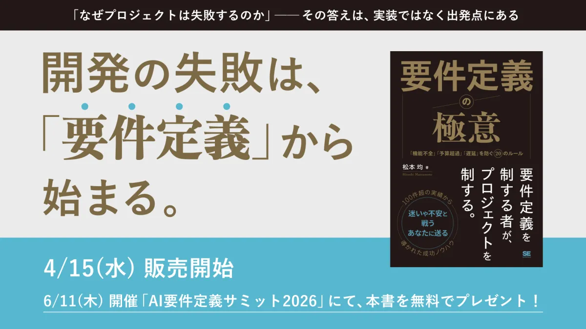 株式会社ROUTE06が、プロジェクトの要件定義に関する実務知識を体系化した新しい書籍『要件定義の極意』を2026年4月15日に発売。この書籍は、実際に発生したプロジェクトの失敗事例を通して導き出された「20のルール」を基に、誰もが再現可能な要件定義のノウハウを提供します。