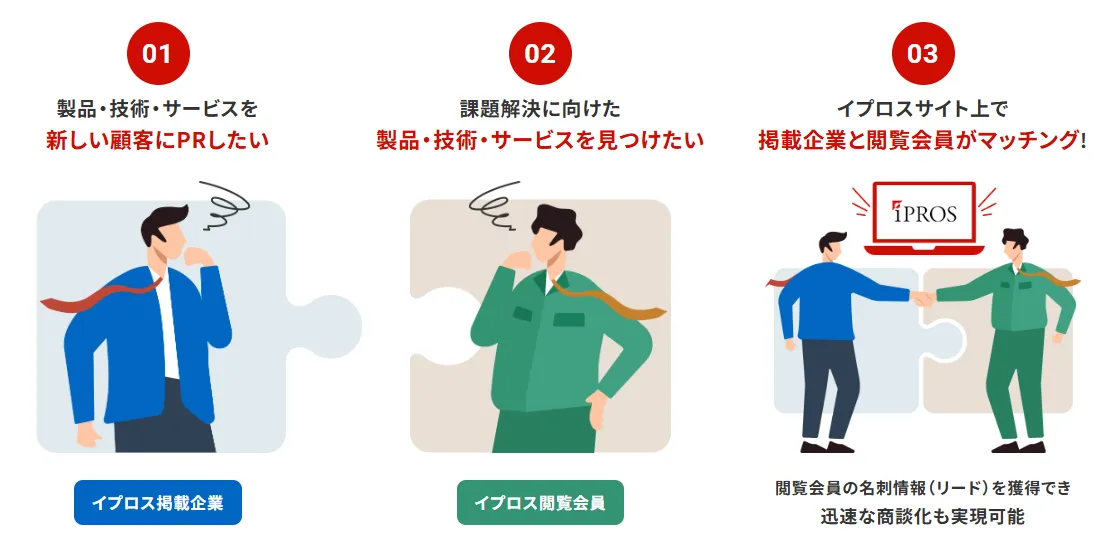 イプロスへの掲載は無料とあって、リスクなく始められるのも大きな魅力です。登録は簡単で、自社の製品やサービスを魅力的にPRするページを作成することができます。さらに、イプロスは登録作業を代行してくれるため、手間をかけずに自社の情報を広めることが可能です。