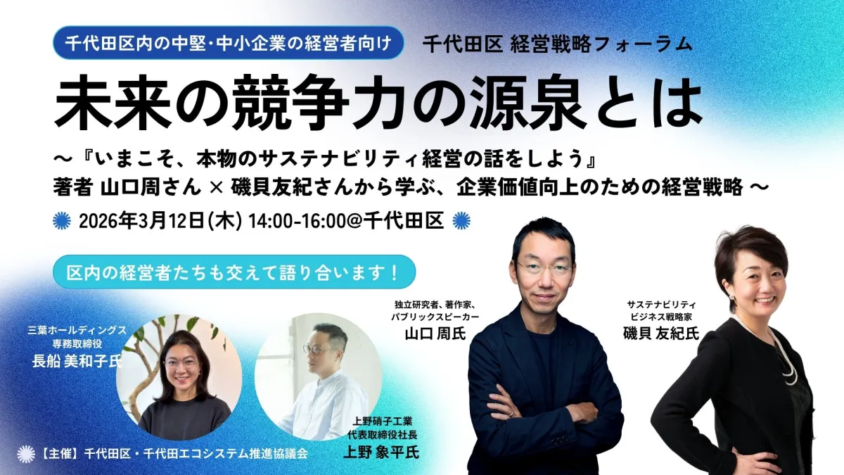 2026年3月12日、東京・千代田区で中堅・中小企業の経営者向けにサステナビリティ経営をテーマにしたセミナーが開催されます。このセミナーでは、著者の山口周さんと磯貝友紀さんのトークセッションを通じて、企業価値向上のための具体的な戦略が紹介されます。
