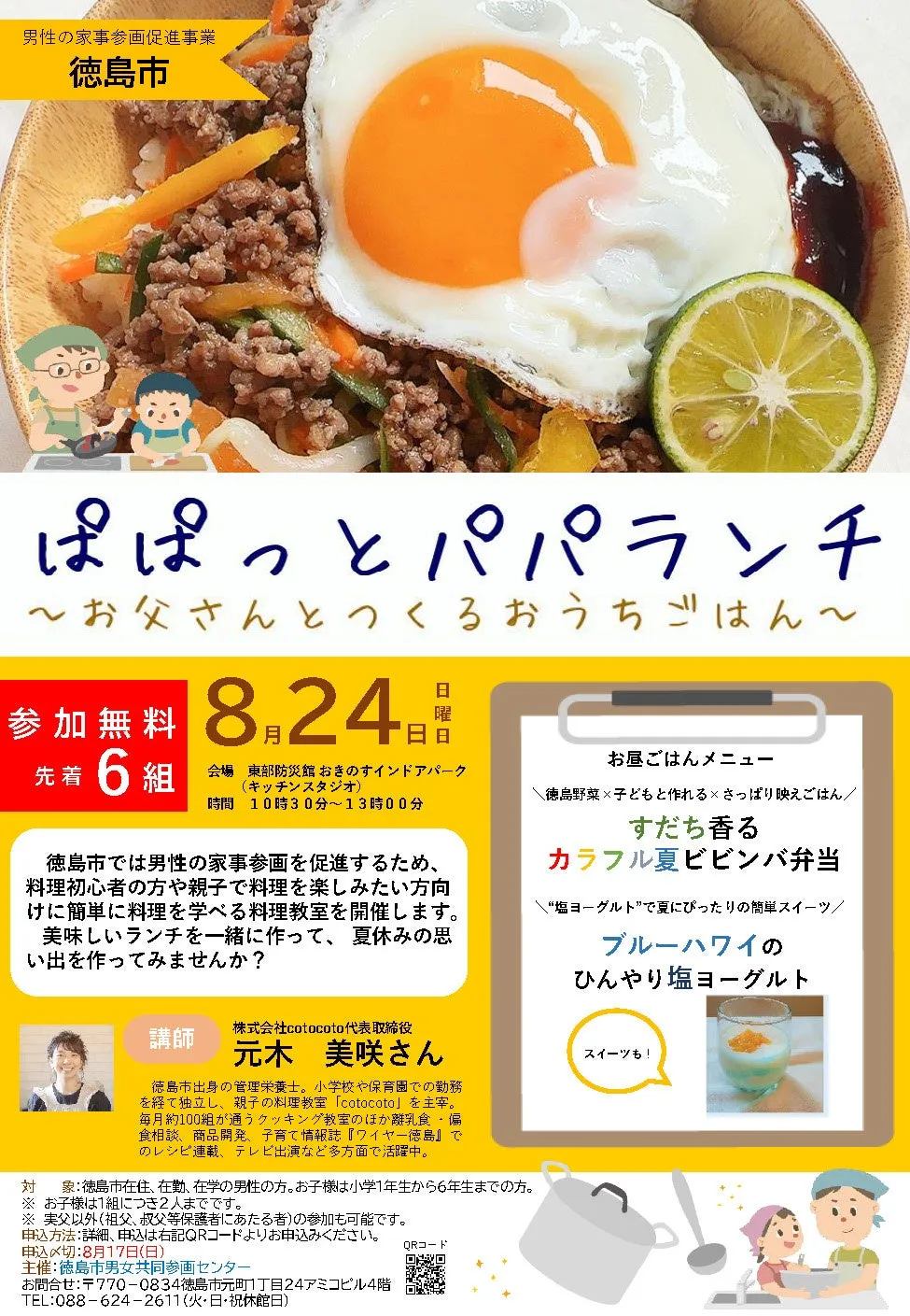 徳島市では、男性の家事への参加を促進するために、特別な料理教室「ぱぱっとパパランチ」を開催します。このイベントは、料理初心者や親子での参加を歓迎しており、親子一緒に簡単にできる料理を学ぶことができます。特に、夏休みの思い出作りにぴったりの機会です。
