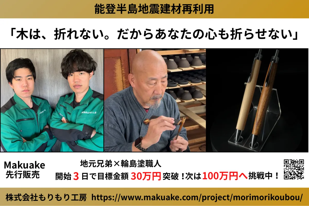 2024年、能登半島は大地震に見舞われ、多くの建材がその厳しい自然の力を受けながらも耐え抜きました。そんな喜びと悲しみを内包した木を使って、石川県羽咋市の年子兄弟が立ち上げた「株式会社もりもり工房」は、木軸ペンの大胆なプロジェクトに挑戦しています。彼らはコンパクトなクラウドファンディングサイトMakuakeにて、目標金額をわずか32時間で達成しました。