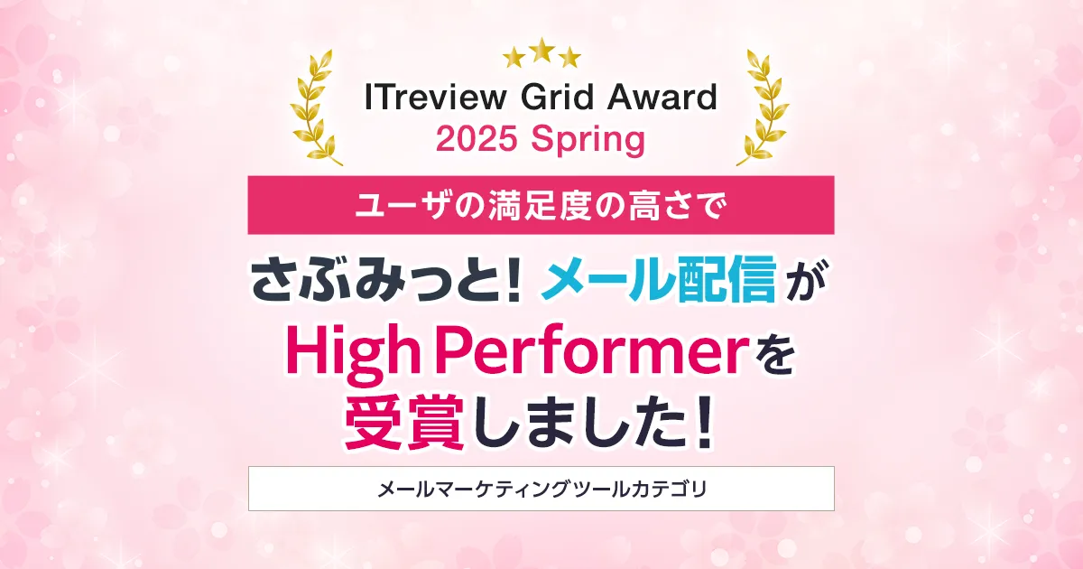 High Performerとは、ITreviewに集まった約13.8万件のレビューをもとに、顧客満足度や市場での認知度が優れていると認められた製品に授与される称号です。特に、これからの成長が期待される製品であるとされ、さぶみっと!メール配信はその名の通り、高い顧客満足度を誇る製品としての地位を確立しました。これが「さぶみっと!メール配信」の特別な魅力の一つです。