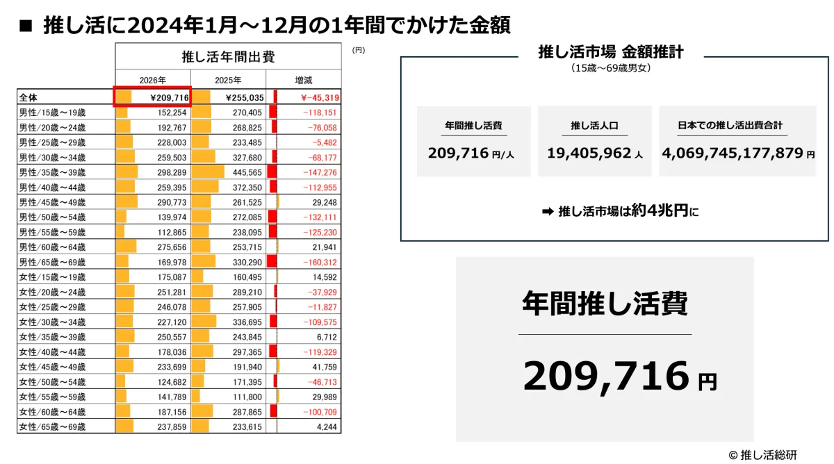 調査結果によると、推し活を行う人々の年間平均支出は209,716円とされ、前年の255,035円から若干の低下をしました。このことから、市場全体の拡大は続いているものの、個々の参加者の出費には幅があることが明らかになりました。中央値は4万円で、支出の高低が顕著です。