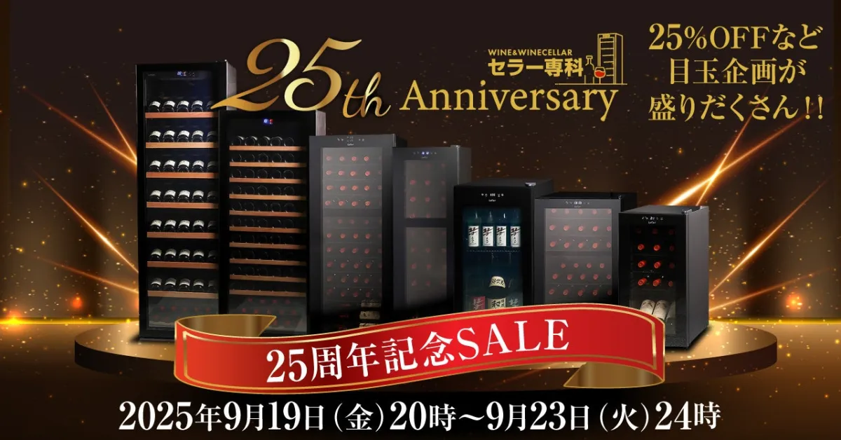 ワインセラー専門の通販サイト「セラー専科」が、2023年9月に創業25周年を迎えました。この特別な年を記念し、顧客への感謝の気持ちを込めて「創業25周年記念セール」を実施しています。セールの期間は2023年9月19日(金)から23日(火)までの5日間。特に注目すべきは、最大25%OFFで提供される数々のアイテムです。