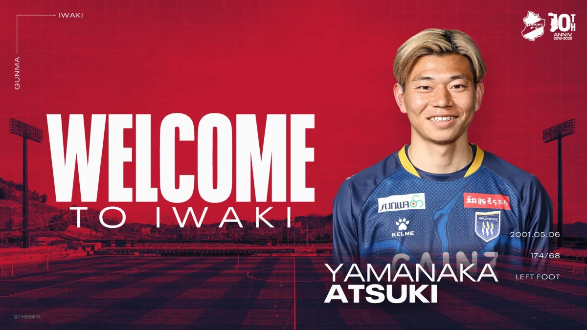 「このたび、いわきFCに完全移籍で加入することになりました。山中惇希です。情熱あるこのクラブの一員になれることを、心から誇りに思います。いわきの地で、勝利のためにすべてを懸けて戦います。そして、浜を照らす光になれるよう、どんな時も全力で走り続けます。皆さんと一緒に戦える日々が本当に楽しみです。よろしくお願いします!」