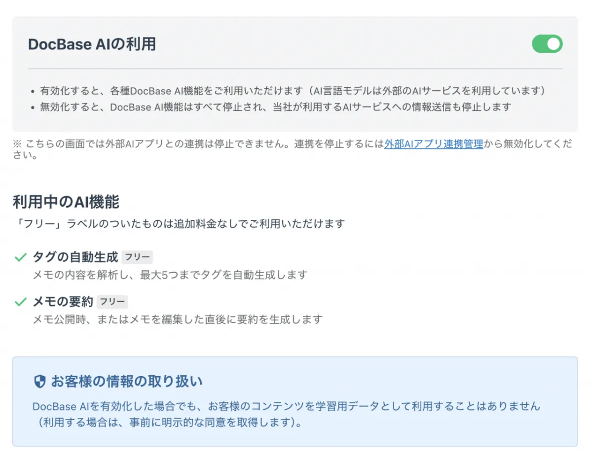 DocBase AIは、情報の安全性を高めるための様々な機能を搭載しています。特定のメモに「no-ai」タグを付与することで、そのメモはAI処理の対象外として設定できます。また、AI機能の利用履歴を記録し、管理者が監査や分析に活用できるCSVファイルのダウンロードが可能です。これにより、ユーザーは安心して機能を利用できます。
