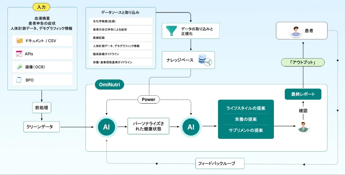 最新のAI技術が投入された『Omi Nutri』は、高度なナレッジグラフや情報検索機能を持ち、強化学習を活用しています。また、AIによる判断には常に専門家が介入するHuman-in-the-loop方式を採用しており、高い信頼性と安全性を確保しています。さらに、国際基準に準拠したデータベースを活かし、多様な利用シーンでの応用が期待されます。