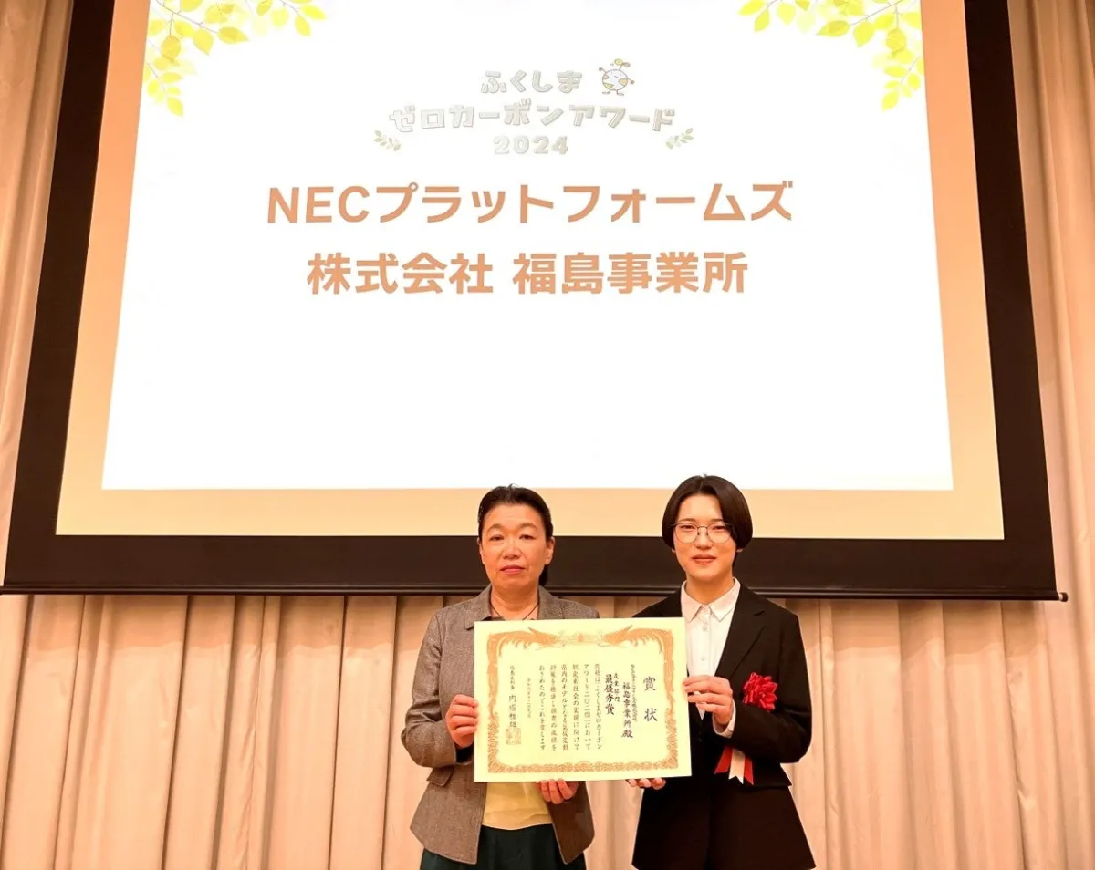 NECプラットフォームズの福島事業所が、2024年12月に「ふくしまゼロカーボンアワード」で産業部門の最優秀賞を受賞しました。この賞は、福島県内で地球温暖化対策に先駆けて取り組む事業者を表彰するもので、福島県が主催する大変意義深いものです。受賞式は、ホテル福島グリーンパレスで開催され、福島県の代表から表彰される光栄な瞬間がありました。