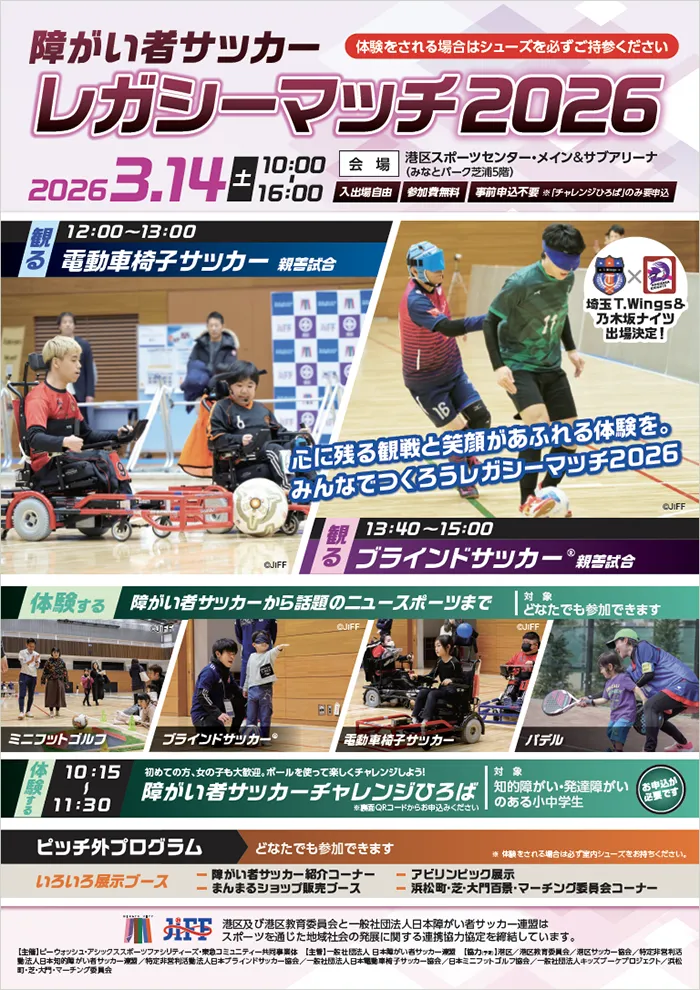2026年3月14日(土)、港区スポーツセンターにおいて「障がい者サッカーレガシーマッチ2026」が開催されます。このイベントは、一般社団法人日本障がい者サッカー連盟(JIFF)と東京都港区の協力のもとで実施され、年々内容が充実してきています。