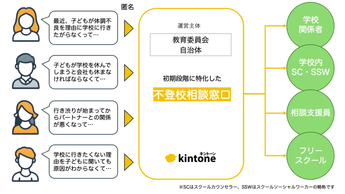 この提案は、保護者が必要な情報やサポートにアクセスでき、自治体や学校、フリースクールと連携を深めることを目指しています。具体的には、サイボウズの業務改善プラットフォーム「kintone」を使用して、オンラインで相談や情報共有を行える仕組みを構築します。