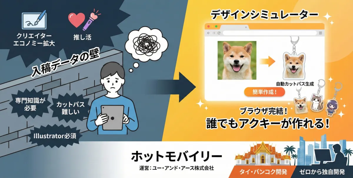 特に、アクリルキーホルダーはその透明感や自由な形状から、多くのクリエイターやファンに支持されています。しかし、これまでアクリルキーホルダーを制作する際には、習熟が必要な工程が多く、一般ユーザーにとって高いハードルとなっていました。特に「入稿データの作成」は、初心者にとっては障壁となることが多かったのです。 そこで、ホットモバイリーがこの課題の解決に挑みました。