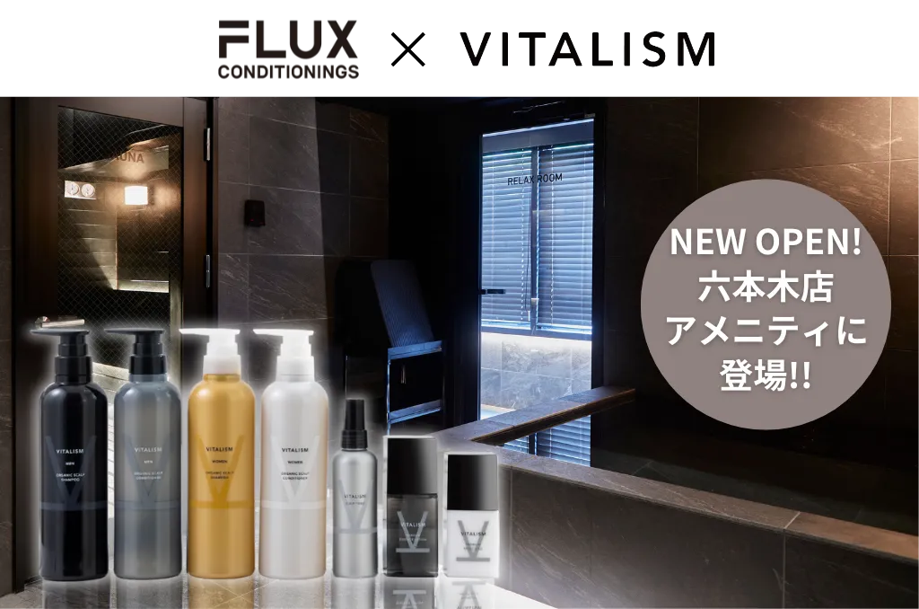 東京都港区六本木に新しくオープンしたパーソナルトレーニング×サウナ「FLUX CONDITIONINGS」のアメニティとして、株式会社ヘアジニアス・ラボラトリーズが展開するトータルケアブランド「VITALISM」のラインナップが採用されました。