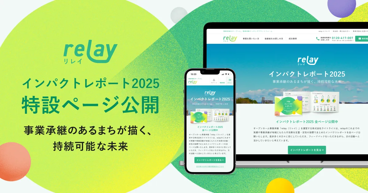 「地域に、光をあてる。」をミッションとするライトライトは、今後もオープンな事業承継文化の創出に向けて取り組んでいきます。企業の持続可能な成長や地域社会の復興を実現するため、事業承継支援の重要性を広めていくことが求められています。relayは、その選択肢を通じて多くの人々に新たな可能性を提供し、未来の地域を育んでいくことを目指しているのです。