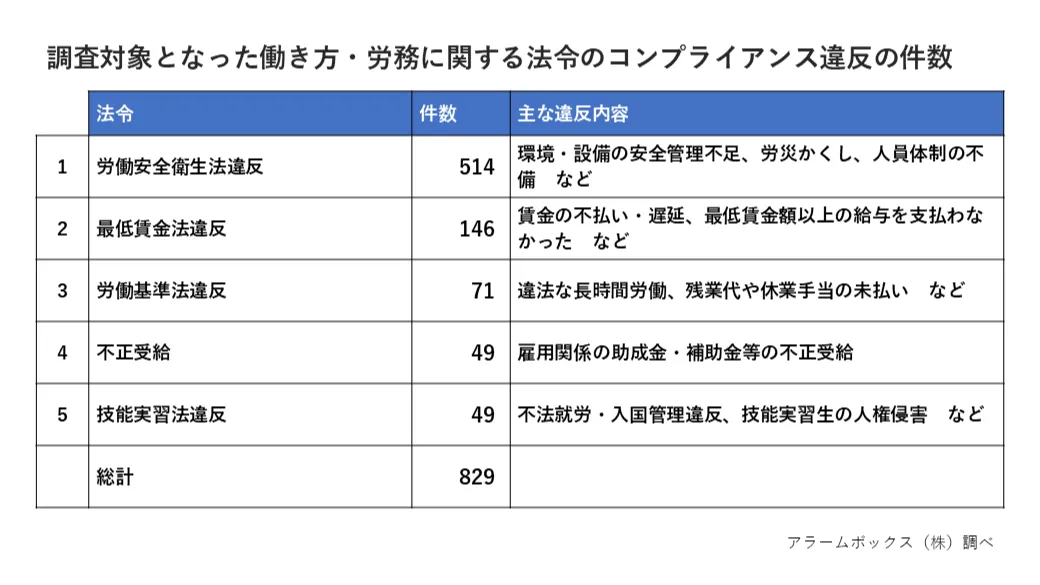 アラームボックス株式会社が発表した2024年の働き方・労務に関する法令コンプライアンス違反調査の結果、違反件数が829件に達しました。この調査は、官公庁が公表した情報をもとに、具体的な違反内容や業種別リスクを分析したものです。