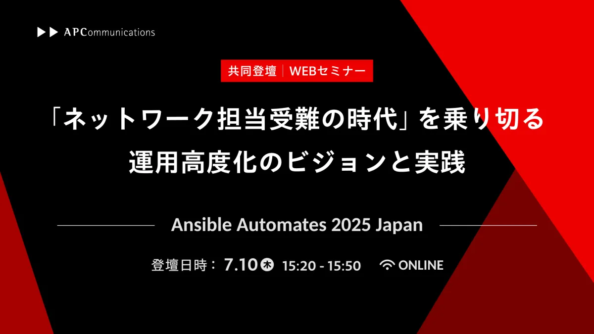 2025年7月10日、ITの専門家や技術者たちが注目するイベント「Ansible Automates 2025 Japan」が開催されます。主催はレッドハット株式会社で、このセッションでは、ネットワーク担当者が直面する課題「ネットワーク担当受難の時代」に対する運用高度化のビジョンと実践が語られます。そこで登壇するのは、エーピーコミュニケーションズの木村昌哉氏とSOMPOシステムズの横森直樹氏。