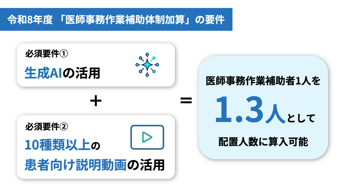新たに設けられる医師事務作業補助体制加算には、看護師が担当する患者説明動画の活用が求められます。この基準に基づき、10種類以上の患者向け説明動画を導入することで、医師事務作業補助者を1.3人として算入できます。これは病院経営にとって魅力的な措置ですが、看護現場への影響を無視してはいけません。