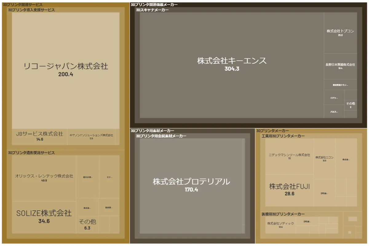 このカオスマップは、3Dプリンティング業界の市場規模の大きさを表すために、企業ごとに面積の大きさで視覚化されています。カオスマップの掲載ページでは、こちらのデータ可視化ツールを使用して詳細を確認することが可能です。具体的なURLは