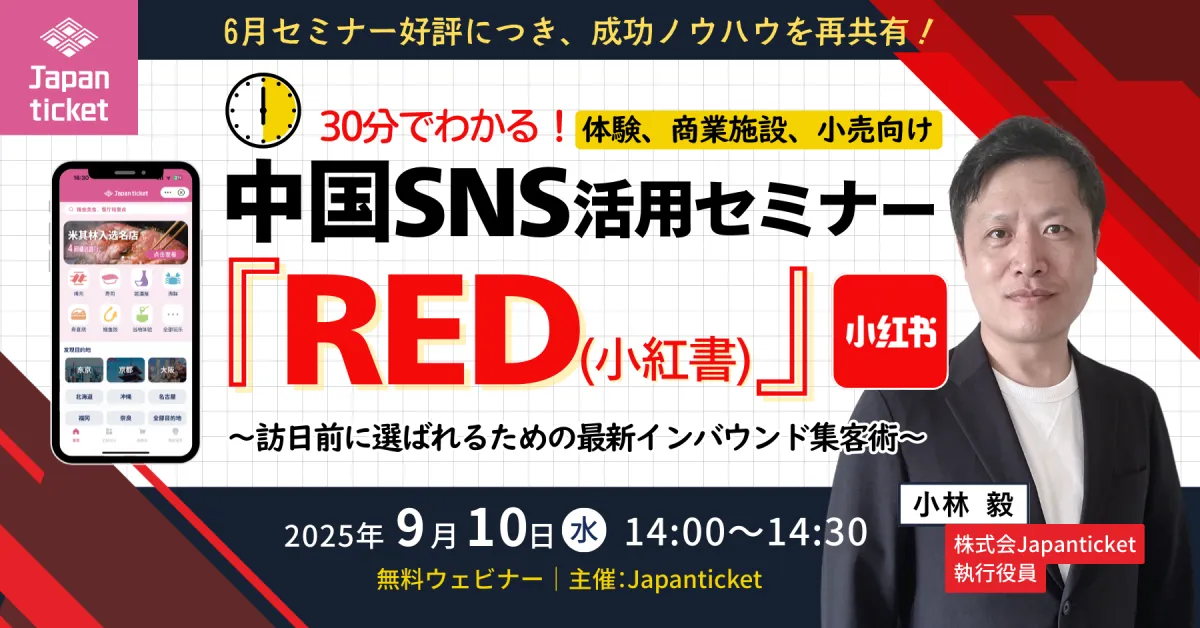 株式会社Japanticketが提供するインバウンド集客向けeチケット管理システム「Japan ticket」は、2025年9月10日(水)にオンラインセミナーを開催します。このセミナーでは、中国SNS「RED(小紅書)」を活用した集客方法に焦点を当て、30分でそのエッセンスを学べる貴重な機会となっています。