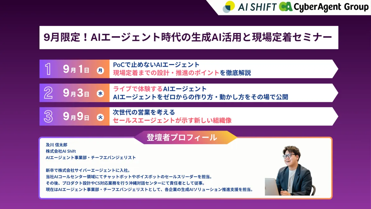 株式会社サイバーエージェントの子会社であるAI Shiftでは、企業における生成AI技術の導入とその定着を目的としたオンラインセミナーを開催します。このセミナーは、特に現場での課題解決や技術の実装に焦点を当てた内容になっています。
