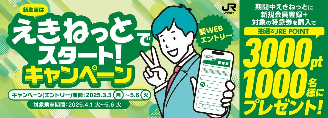 JR東日本は、利用者の便宜を図るために「えきねっと」というインターネット予約サービスを提供しています。特に新生活が始まる季節に合わせて、「新生活はえきねっとでスタート!」キャンペーンを開催します。本キャンペーンでは、初めて「えきねっと」で新幹線や特急列車の特急券を購入した方が対象となり、抽選でJRE POINT3,000ポイントをプレゼントします。多くのお客様にご利用いただきたいという思いから、この魅力的なキャンペーンが企画されました。