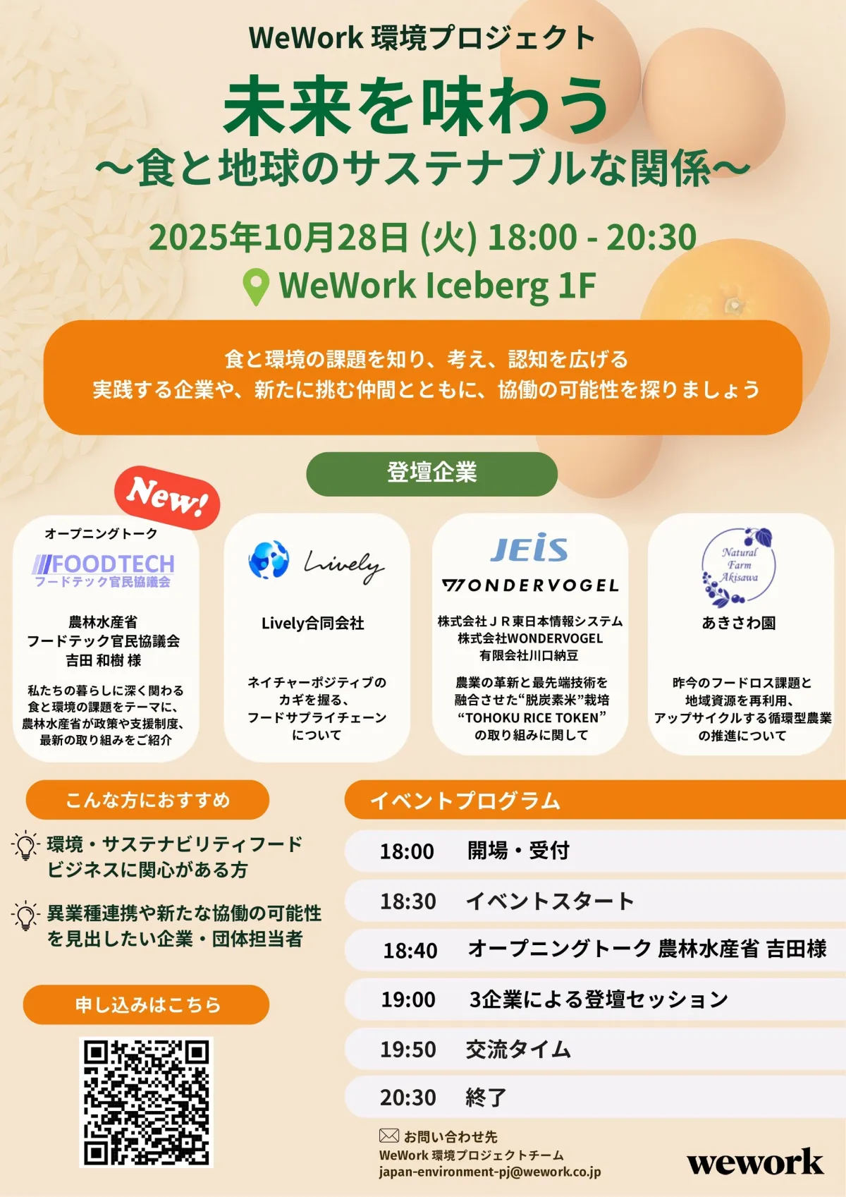 2025年10月28日、WeWork Japanが主催するイベント「未来を味わう~食と地球のサステナブルな関係~」に、Lively合同会社の代表、種田 毅氏および三浦 友見氏が登壇します。このセッションでは、「ネイチャーポジティブのカギを握るフードサプライチェーン」というテーマに基づき、リジェネラティブ農業とアニマルウェルフェアに関する取り組みが紹介される予定です。