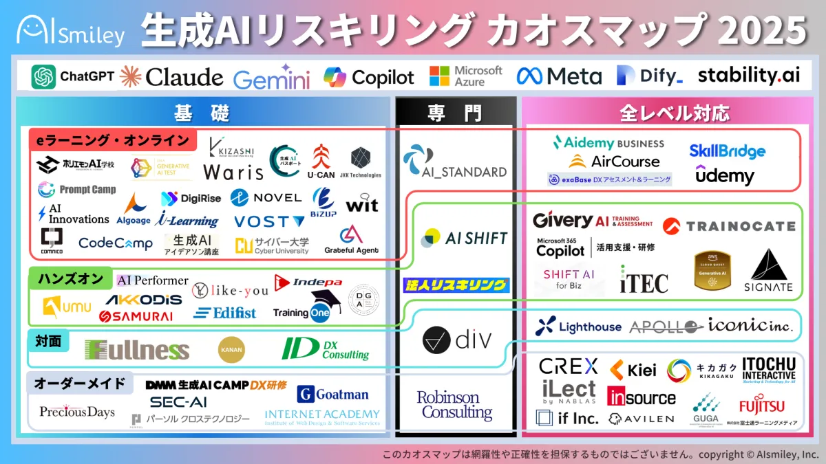 最近のテクノロジーの進化には目を見張るものがありますが、中でも生成AIの成長は企業にとって大きな挑戦をもたらしています。株式会社アイスマイリー(東京都渋谷区、代表取締役:板羽晃司)は、この流れを受けて、2025年1月17日(金)に「生成AIリスキリングカオスマップ 2025」を公表しました。このカオスマップには、74のリスキリングサービスが掲載されています。