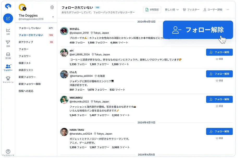 また、受信箱からも特定のキーワードを含む投稿やメンションされた内容に基づいてフォローやフォロー解除ができます。これにより、気になるアカウントをその場でフォローすることができ、日々の運用をさらに効率的に支援してくれます。