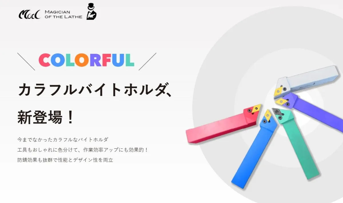 この製品は、赤、青、白、緑、紫の5色展開で、ツールの識別をしやすくします。これにより工程ごとの色分けが可能となり、作業ミスの削減が期待されます。また、特許申請中のこのバイトホルダは、カラーコーティングによる防錆効果を持ち、長寿命が保証されています。さらに精密な刃先設計によって高い加工精度も実現されています。
