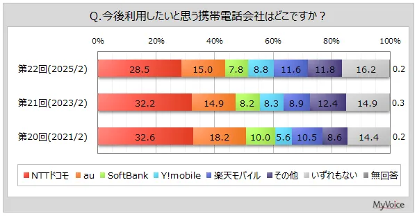調査結果によると、今後最も利用したい携帯電話会社のトップはNTTドコモで、その意向は約28.5%に達しました。これに対して、auが15%、楽天モバイルが11.6%と続いており、NTTドコモの圧倒的な支持が伺えます。継続利用意向も高く、同社を主に利用している方の約8割が今後も使用し続けたいと考えています。
