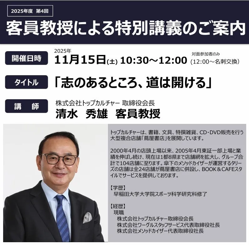 事業創造大学院大学(新潟県新潟市中央区米山)は、2025年11月15日(土)の10:30から12:00まで、特別講義「志のあるところ、道は開ける」を開催します。この講義は、株式会社トップカルチャー取締役会長である清水秀雄客員教授が講師を務めます。一般の方々も参加でき、対面での参加およびオンライン視聴の両方が可能ですが、対面参加者には名刺交換の機会も設けられています。