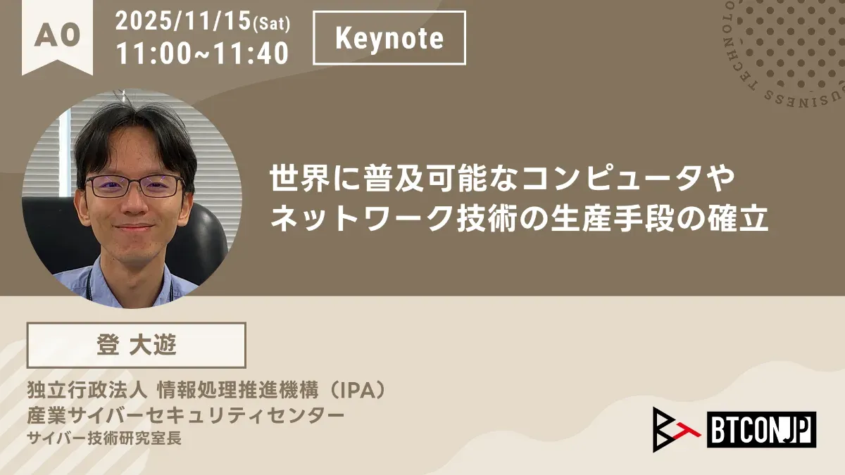 2025年11月15日(土)、東京にて「Business Technology Conference Japan(BTCONJP 2025)」が開催されます。この重要なイベントのメインプログラムの一つとして、登大遊氏が基調講演を行うことが発表されました。本講演のテーマは「世界に普及可能なコンピュータやネットワーク技術の生産手段の確立」です。