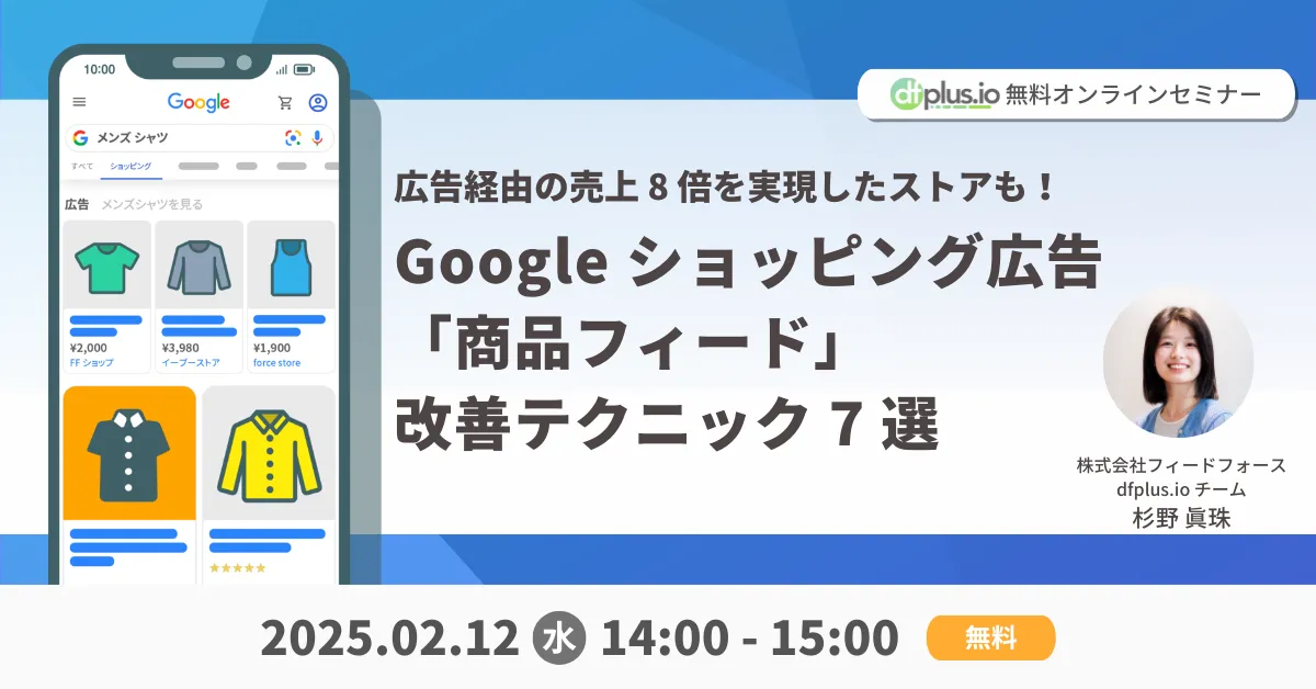 2025年2月12日(水)、株式会社フィードフォースが提供する無料オンラインセミナー「Google ショッピング広告の商品フィード改善テクニック 7 選」が開催されました。このセミナーは、マーケターのためのデータフィード管理ツール「dfplus.io」を活用した内容で、多くの参加者にとって非常に有益な情報が共有されました。